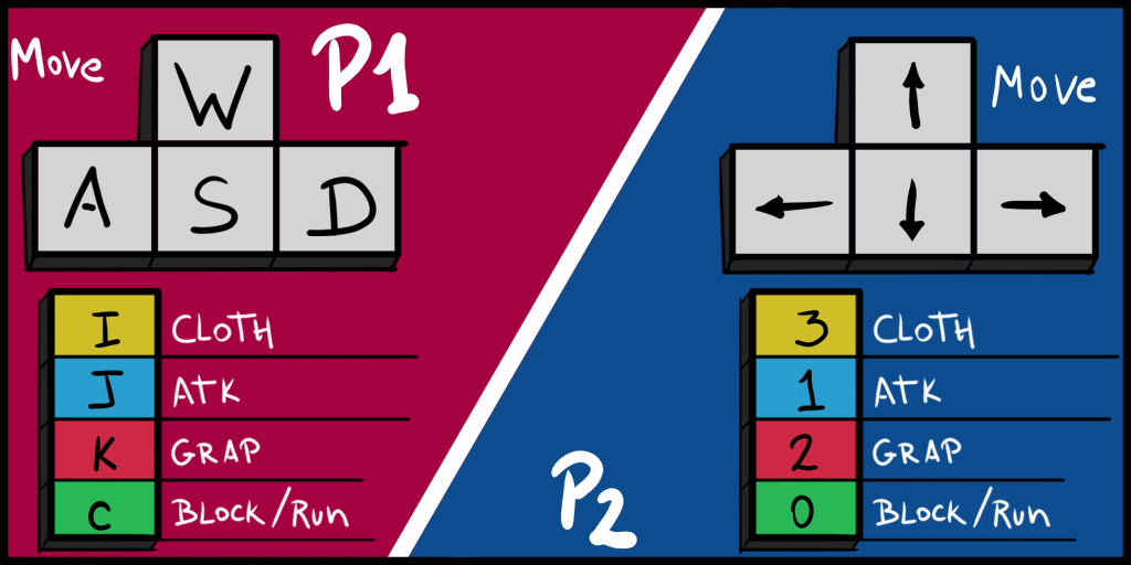 P1 =[A,S,W,D (Move) J,K(Strikes) E(Grap) Q(Turn) C(Block)]